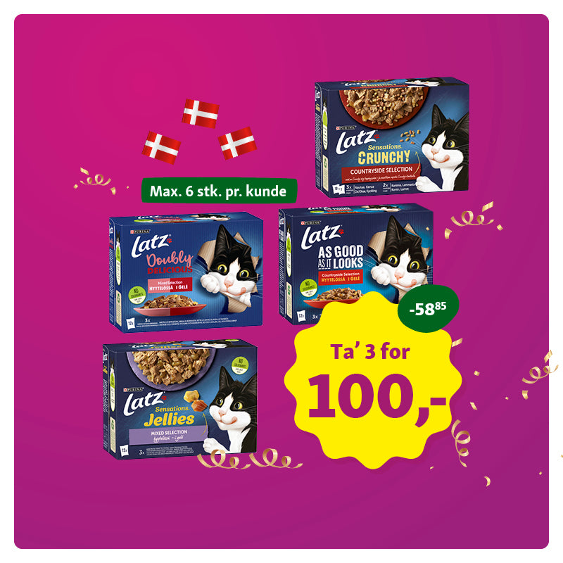 Menuboks med vådfoder i portionsposer til katte.Frit valg mellem flere varianter, 10-12x85 g.Stk. pris 52,95.
