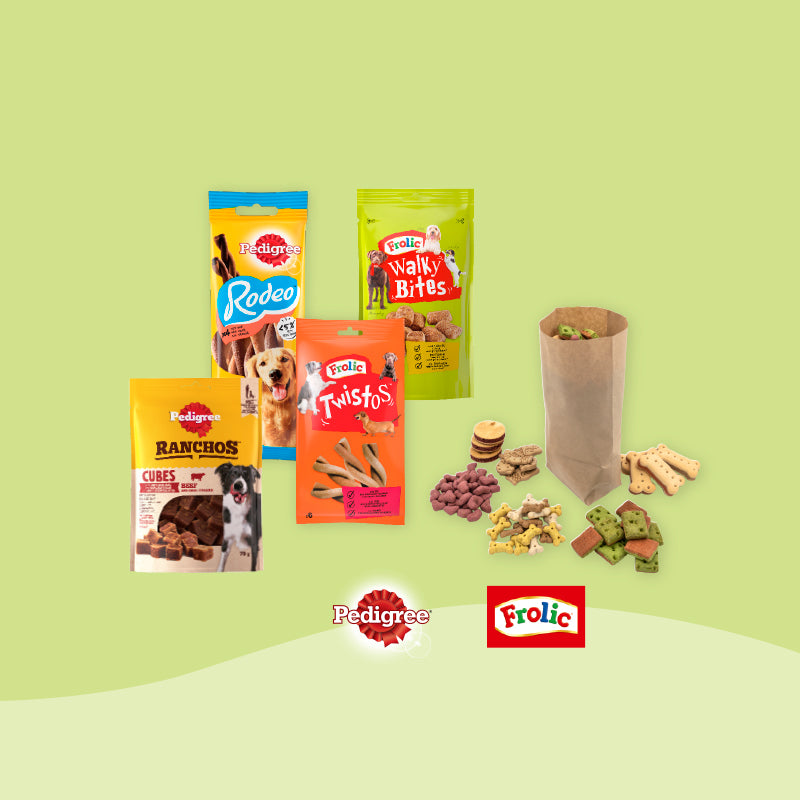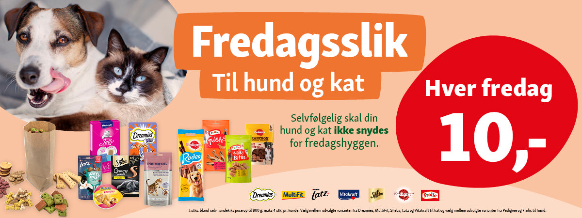Hver fredag kan du vælge mellem lækre snacks fra Pedigree og Frolich, eller blande op til 800 g hundekiks for 10 kr. i butikken.