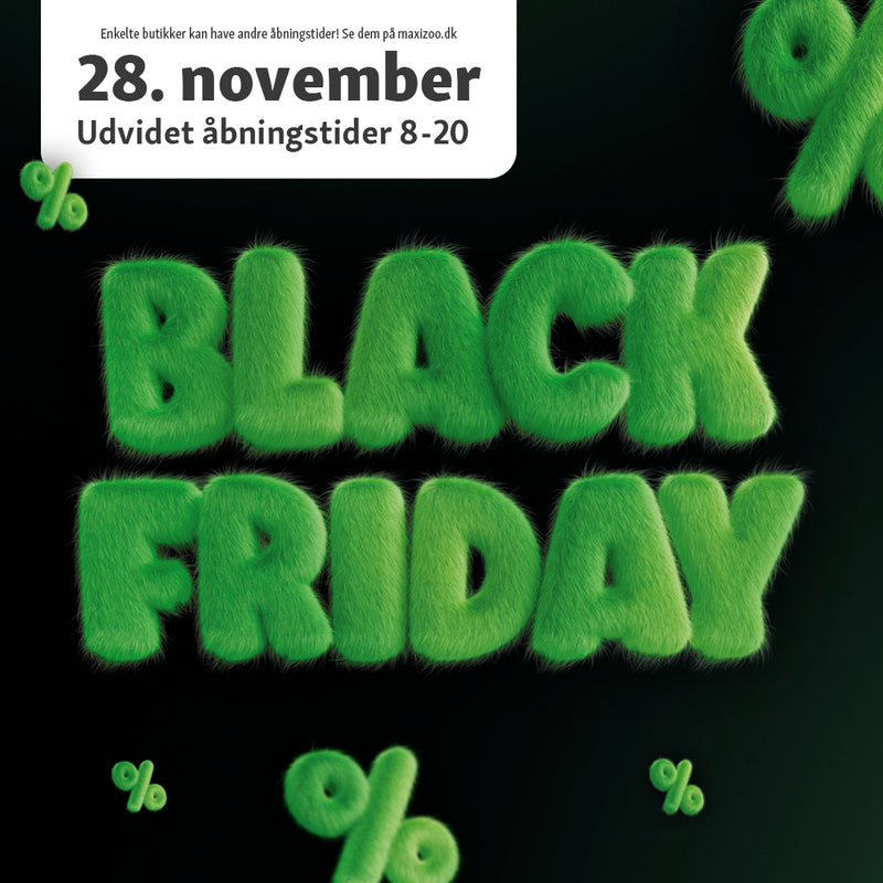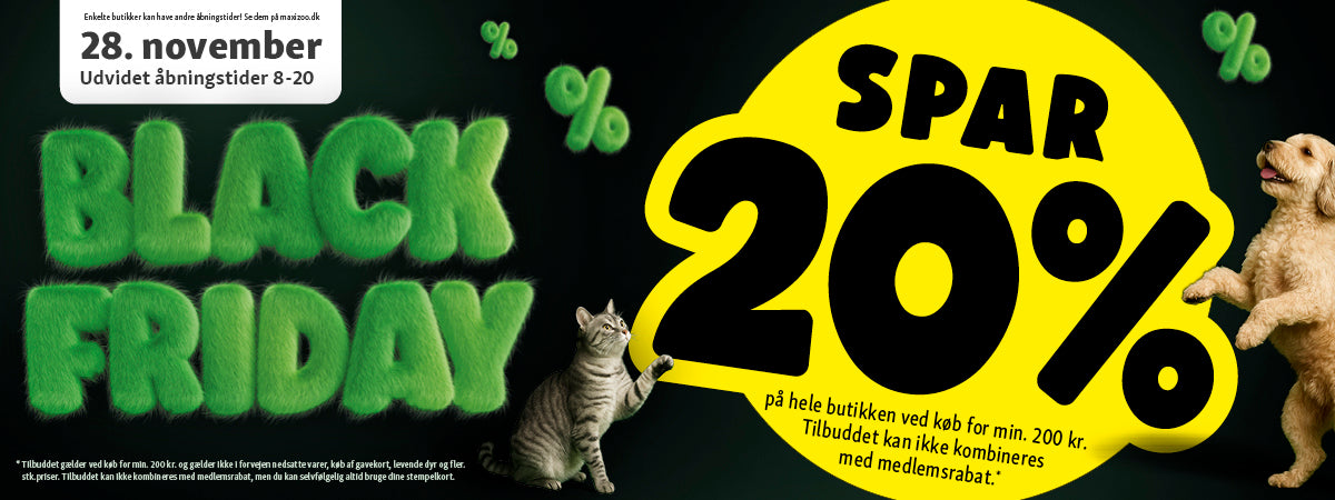 Black Friday skydes igang hos Maxi Zoo d. 28. november 2025 med 20% på alle varer - ved køb af min. 200 kr. Tilbuddene vil være gældende både online på maxizoo.dk og i alle vores fysiske butikker