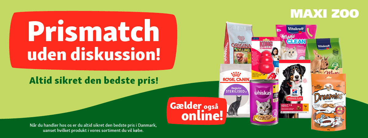 Prismatch betyder, at vi i Maxi Zoo matcher laveste priser på markedet. Hos Maxi Zoo stræber vi efter at have det bredeste udvalg af varer til de laveste priser. Nogle gange er der dog nogle af vores konkurrenter, som tilbyder en identisk vare billigere end vi gør. I det tilfælde matcher vi prisen!