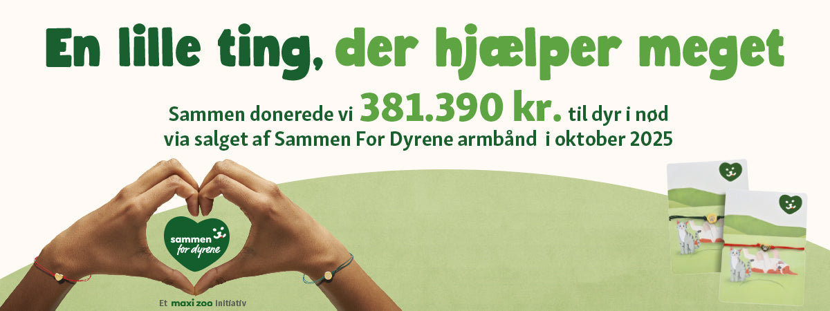 I 2025 stod vi igen sammen med alle jer og støttede Dyrenes Beskyttelses flotte arbejde for dyr i nød, med vores velgørenhedskampagne Sammen For Dyrene. Hele oktober måned solgte vi i 2025 de fine armbånd, til 25 kr. hvoraf Maxi Zoo donerede 15 kr. pr. solgte armbånd, som gjorde at vi sidste år via kampagnen kunne sende hele 381.390 kr. afsted til Dyrenes Beskyttelse. Endnu en gang tak for jer og jeres store støtte og arrangement, så vi sammen kan støtte Dyrenes Beskyttelse og deres arbejde for dyr i nød.