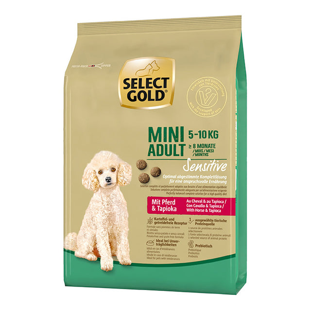 SELECT GOLD Sensitive Mini Adult med Hest & Tapioka er et specialudviklet og afbalanceret tørfoder af høj kvalitet til små fuldvoksne hunde (slutvægt 5–10kg) fra ca. 8. levemåned. Dette førsteklasses kvalitetstørfoder indeholder let fordøjelige ingredienser og egner sig derfor især til ernæringsfølsomme hunde samt ved foderintolerance. Ved udviklingen af den førsteklasses opskrift er der taget målrettet hensyn til de ernæringsfysiologiske krav hos små fuldvoksne hunde.