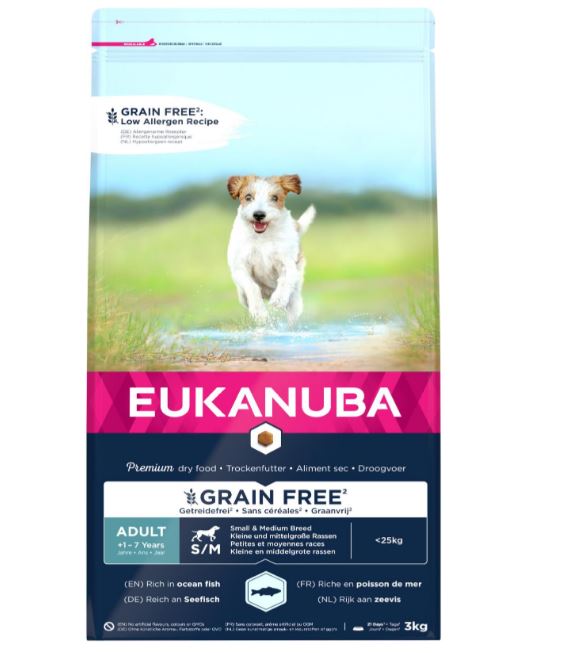 Eukanuba Grain Free* til voksne hunde af små og mellemstore racer er 100 % komplet og afbalanceret, så din hund har det godt.