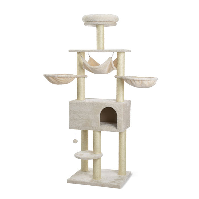 Kradsetræet har polstrede overflader, og inkluderer sjovt legetøj, en lille bold i en snor, og det har ekstra store ligge-/hvilepladser til flere katte.