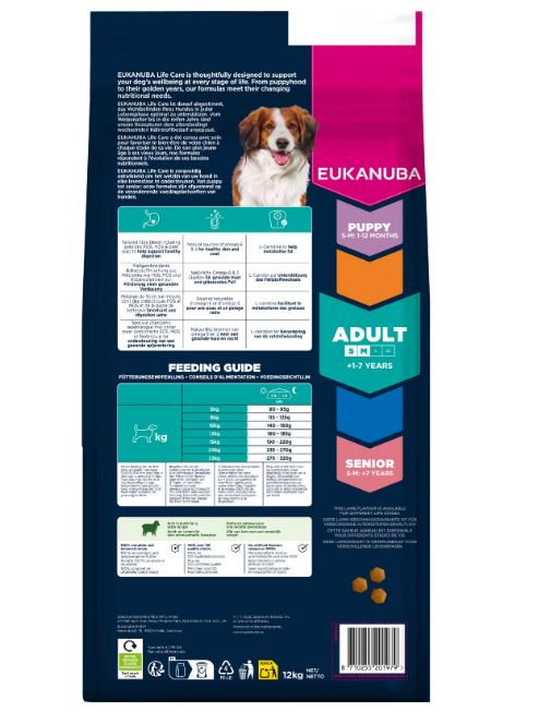 Eukanuba tørfoder i pilleform som har et højt indhold af lammekød og ris og er velegnet til voksne hunde af små og mellemstore racer. Det er desuden særligt velegnet til hunde med sart mave, fordi det førsteklasses lammekød og ris er ekstra let at fordøje. Specialblandingen af fibre med kostfibre og roetrævler fremmer desuden sund fordøjelse. Foderet indeholder desuden naturlige kilder til glucosamin og calcium, som hjælper med ledsundhed og stærke knogler til gavn for et aktivt hundeliv. Ud over lammekødet er kylling en yderligere proteinkilde i foderet til at hjælpe hunde med at opbygge stærk muskelmasse. Eukanuba tørfoder indeholder desuden L-carnitin. Det fremmer reducering af kropsfedt, så hunden kan opretholde en optimal vægt, og leddene belastes mindre. De specialudviklede, sekskantede Eukanuba tørfoderpiller og foderets DentaDefense-tandplejesystem støtter rene, sunde tænder på lang sigt. Eukanuba tørfoder fremmer desuden sund hud og en blank pels ved hjælp af naturlige kilder til omega-6 og omega-3. Det hjælper desuden med at reducere hårtab hos hunde. Foderet er desuden tilsat gurkemeje, som er en naturlig kilde til antioxidanter til at styrke immunsystemet.