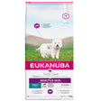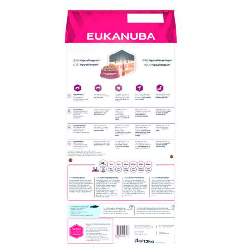 Eukanuba Daily Care Dry Dog Food for Sensitive Skin; formuleret til at begrænse ingredienser, der kan forårsage kløe og kradsning. Foderet er allergivenligt og er specielt formuleret til følsomme hunde og bruger derfor kun en enkelt proteinkilde (fisk). Derudover er formlen beriget med naturlige kilder til omega 6 og 3 for sund hud og pels. Den særlige sekskantede form sammen med den unikke DentaDefense hjælper med at holde tænderne rene og sunde. Eukanuba Daily Care tørfoder til hunde med følsom hud er rig på fisk. Denne naturlige kilde til protein af høj kvalitet understøtter slanke og stærke muskler. Den skræddersyede fiberblanding af præbiotika og roepulp fremmer også en sund fordøjelse.