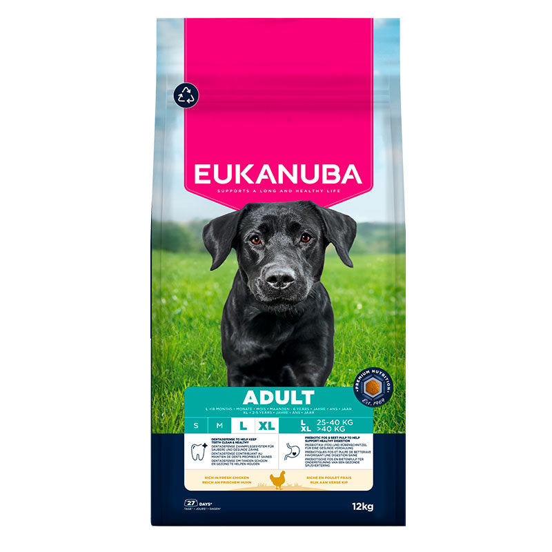 Eukanuba tørfoder i kibble-form indeholder meget fersk kylling og er perfekt til store voksne hunde i alderen 18 måneder til 6 år (eller 2 til 5 år for meget store hunderacer).