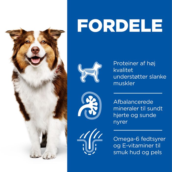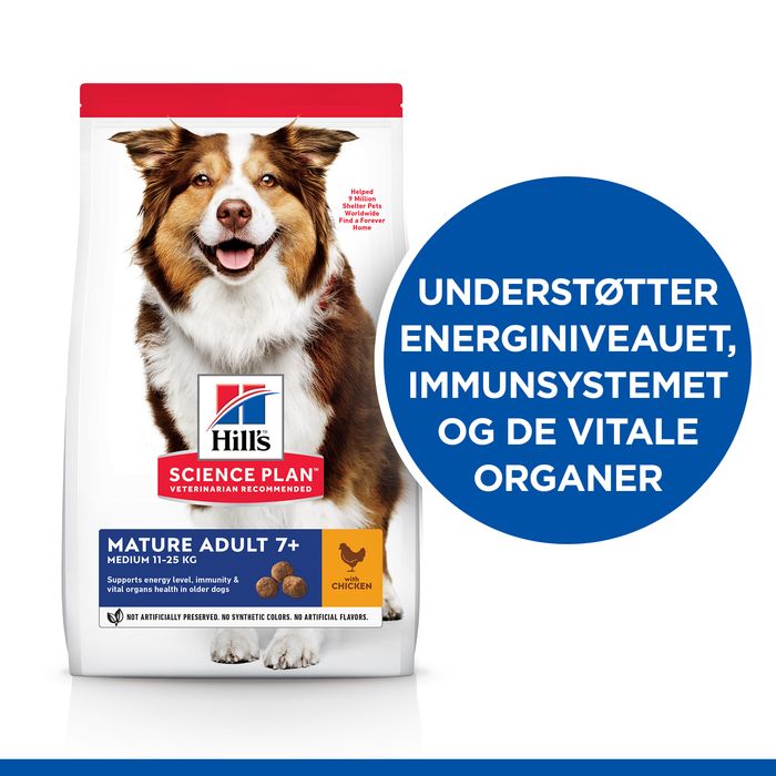 Det kan gøres enkelt at opfylde de unikke ernæringsmæssige behov hos din modne, voksne hund. Derfor består Hill's Science Plan Medium Breed Mature Adult Dry tørfoder til hunde med kylling af lækker, 100% sund og afbalanceret ernæring, der hjælper med at fremme din hunds evne til at leve et dynamisk liv i hverdagen. For at fremme smuk hud og en sund pels er det fremstillet med omega-6 og E-vitamin og giver letfordøjelig ernæring med en synergistisk blanding af ingredienser, der hjælper med at understøtte energi- og aktivitetsniveau. For at understøtte hjerte- og nyresundhed indeholder den afbalancerede mineraler. For at sikre din hunds generelle velbefindende og fordøjelsessundhed er dette foder formuleret med ActivBiome+ teknologi - en unik blanding af præbiotika, der tilfører næring til dens mikrobiom.