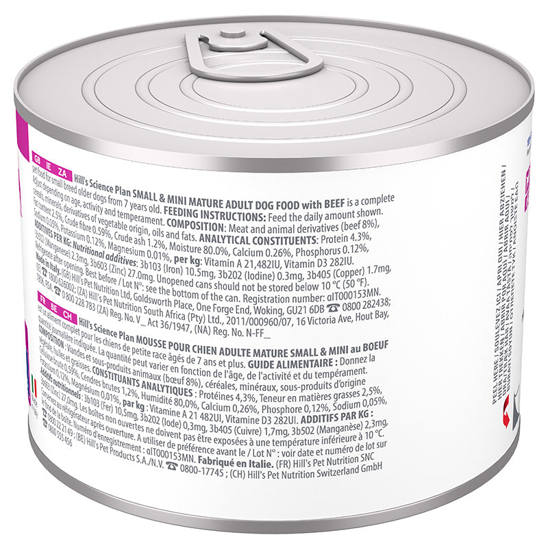 Hill's Science Plan Mature Small & Mini Breed Mousse med oksekød er et fuldfoder til modne hunde af små racer fra 7 år. Det er ernæring sammensat til unikke behov og sund aldring hos hunde af små og mini racer.