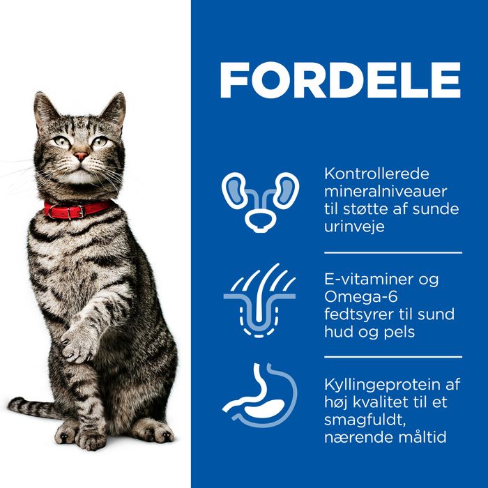 Foder til voksne katte fremstillet med kylling og kontrollerede mineraler for at støtte et sundt urinvejssystem.
