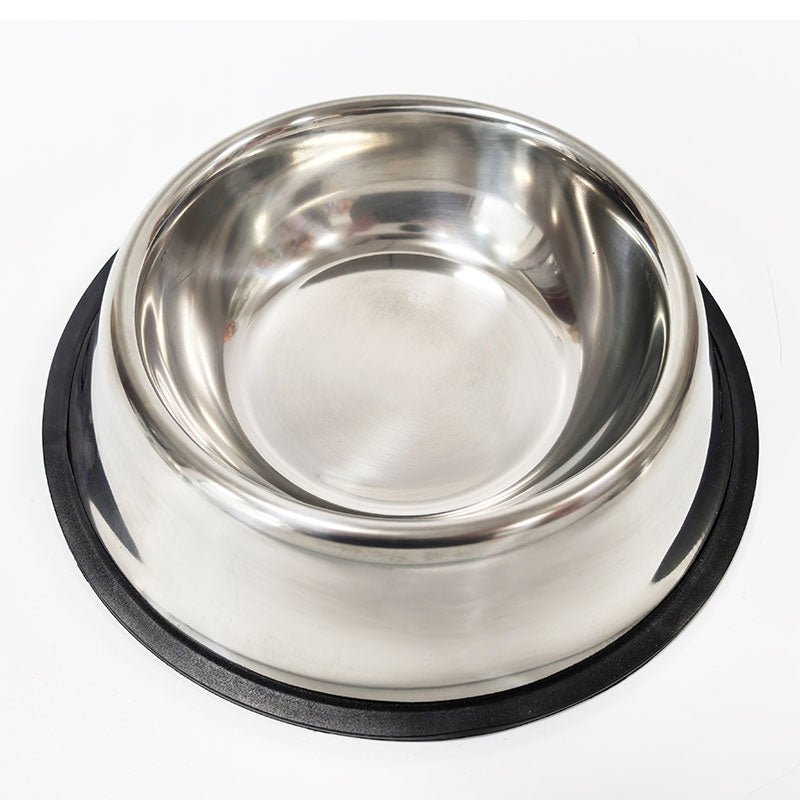 Robust metalskål med skridsikker gummibund, der står stabilt under måltidet.
