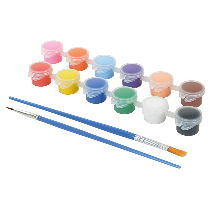Der medfølger 12 vandfaste farver og to pensler.
