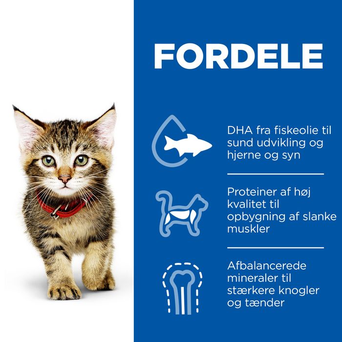 Tørfoder med kylling til katte med DHA fra fiskeolie for øjensundhed og hjerneudvikling samt højkvalitets protein til at støtte muskelvækst. Med afbalancerede mineraler for at fremme stærke knogler og tænder.