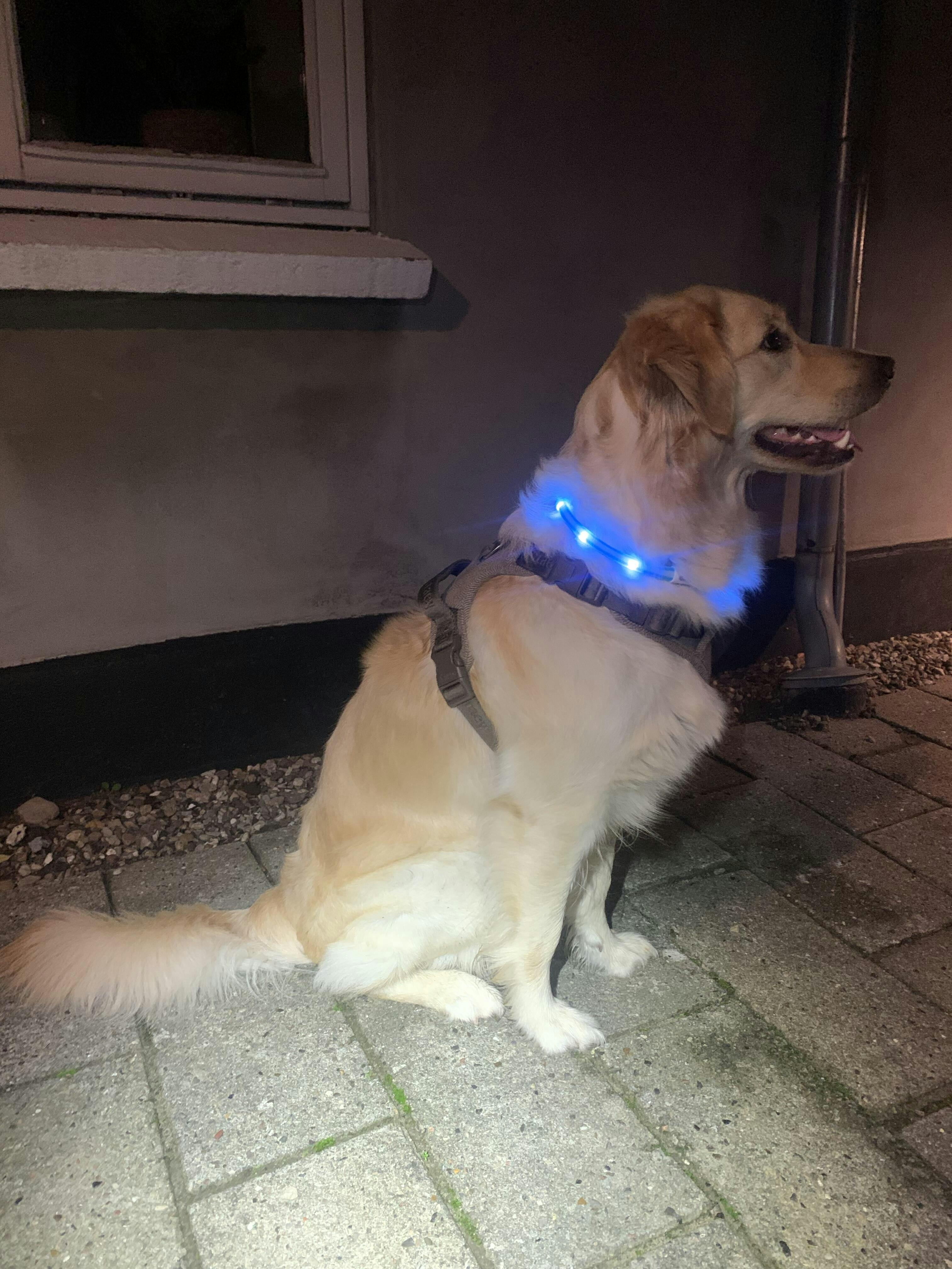 Lyshalsbåndet passer til mellemstore hunde, og kan nemt gøres kortere for individuel tilpasning.