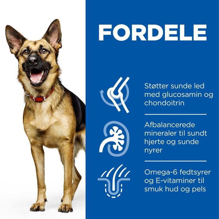 HILL'S SCIENCE PLAN Mature Adult Large Breed hundefoder med kylling støtter energiniveauet og vitale organer hos ældre hunde. Sammensat med omega-6 og E-vitamin for en flot pels, og afbalancerede mineral niveau for hjerte-, nyre- og blære sundhed. Vores unikke opskrift er sammensat specielt til ældre hunde, for at give dem et velsmagende måltid der også indeholder det rette niveau af næringsstoffer, så din hund kan få et langt, sundt og godt liv. Der er mere at holde af ved HILL’S Science Plans nye udseende.
