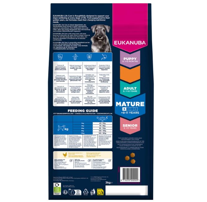 Eukanuba tørfoder er rigt på frisk kylling og perfekt til små modne hunde i alderen fra 8 til 11 år. De udvalgte ingredienser giver skræddersyet ernæring til at støtte din modne hunds sunde aldring. L-carnitin i Eukanuba tørfoder understøtter reduktion af kropsfedt og giver din hund mulighed for at holde en optimal vægt, hvilket resulterer i mindre belastning af leddene. Den skræddersyede fiberblanding af præbiotisk FOS og roepulp fremmer en sund fordøjelse. Indeholder glucosamin, der hjælper med at vedligeholde sunde led, og calcium, der hjælper med at vedligeholde stærke knogler. Desuden er Eukanubas kibbles gavnlige for en sund hud og en skinnende pels takket være de naturlige kilder til omega 6 og omega 3. Foderet indeholder også antioxidanterne vitamin E og C, der hjælper med at understøtte hundens immunsystem. Derudover understøtter de unikke Eukanuba sekskantede brokker og DentaDefense-tandplejesystemet rene, sunde tænder på lang sigt. Foderet er 100 % komplet og afbalanceret. Avanceret ernæring til små modne hunde, der understøtter optimal kropstilstand og livslang velvære.