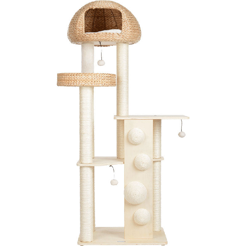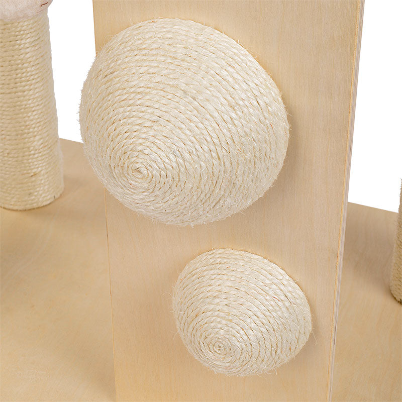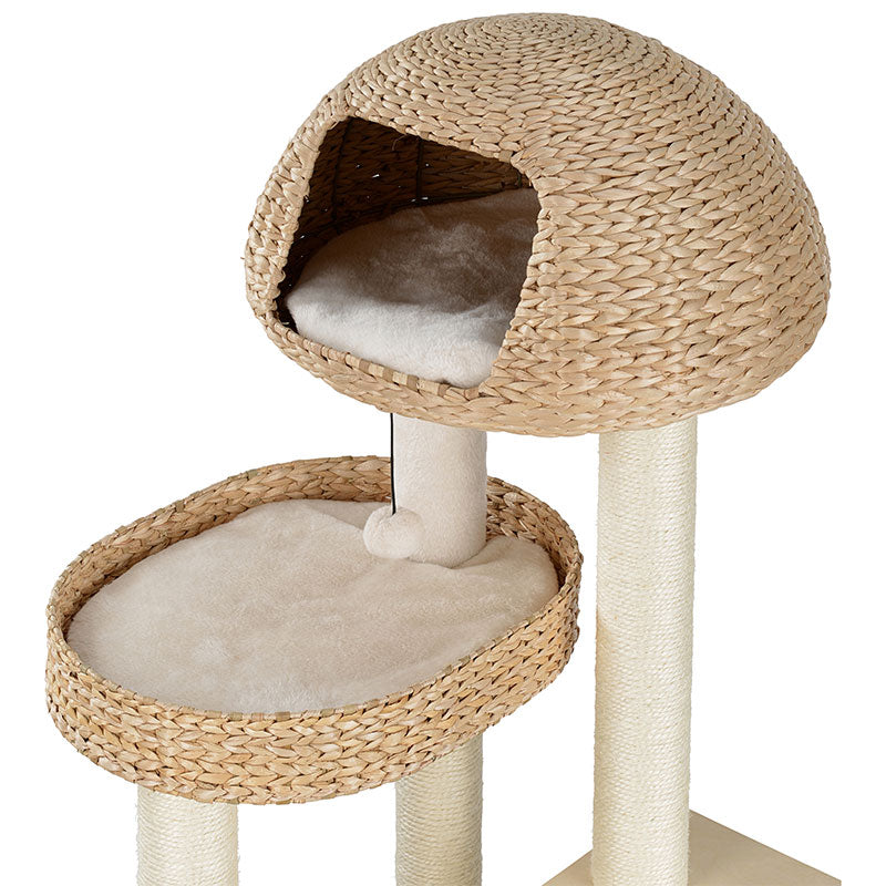 Den robuste konstruktion og de højværdige materialer – herunder træ, sisal, vandhyacint og blødt polyester – sikrer lang holdbarhed, selv for aktive og kraftige katte. Det neutrale design og de varme farver gør, at kradsetræet passer smukt ind i ethvert hjem.