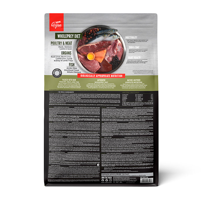 Foderet består af 60 % frisk kød fra en unik blanding af proteinkilder: ged, vildt, fårekød, bøffel, kanin og and fra de canadiske rørskove, samt fjeldørred fra Yukons klare vand og vild torsk fra det kolde Beringhav. Alt er inkluderet i WholePrey™-forhold, hvilket betyder, at både kød, organer og brusk anvendes – præcis som i naturen – og behovet for syntetiske tilsætningsstoffer minimeres.