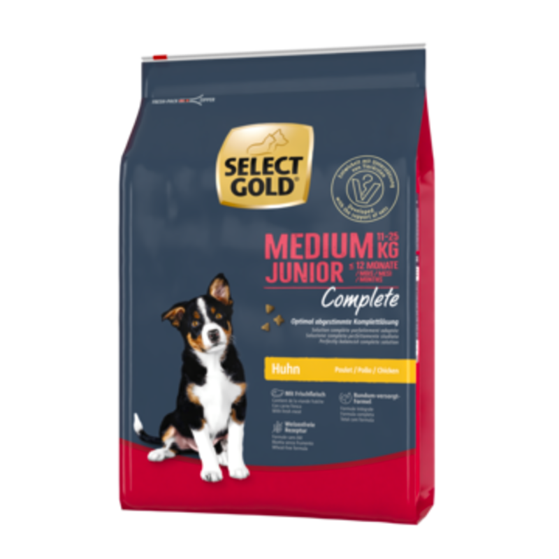 SELECT GOLD junior er specielt velegnet til hvalpe og unghunde og sikrer en ideel ernæring i den vigtigste vækstperiode. Giv din hund junior fra avænning indtil den er ca. 24 måneder gammel (afhængigt af hundens størrelse). Også egnet til drægtig og diegivende tæver. Medium (mellem 11 og 25 kg. i slutvægt): Mellemstore hunde er ofte særligt aktive, de er altid med og opholder sig meget i det fri. Herved udsættes de for mange ydre påvirkninger.