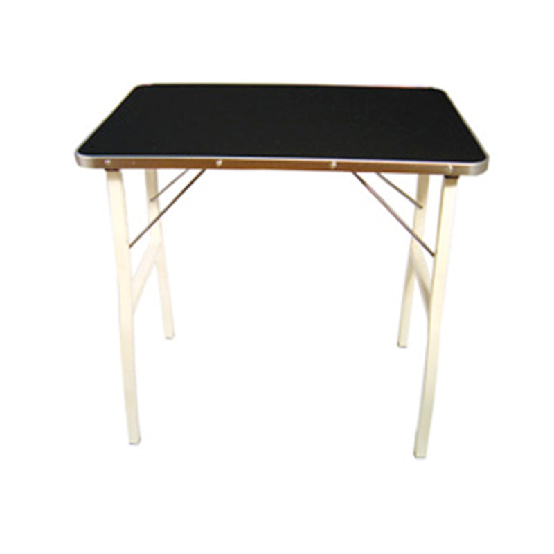 Frisørbordet har et håndtag og sort skridsikker plade og aluminumskant.