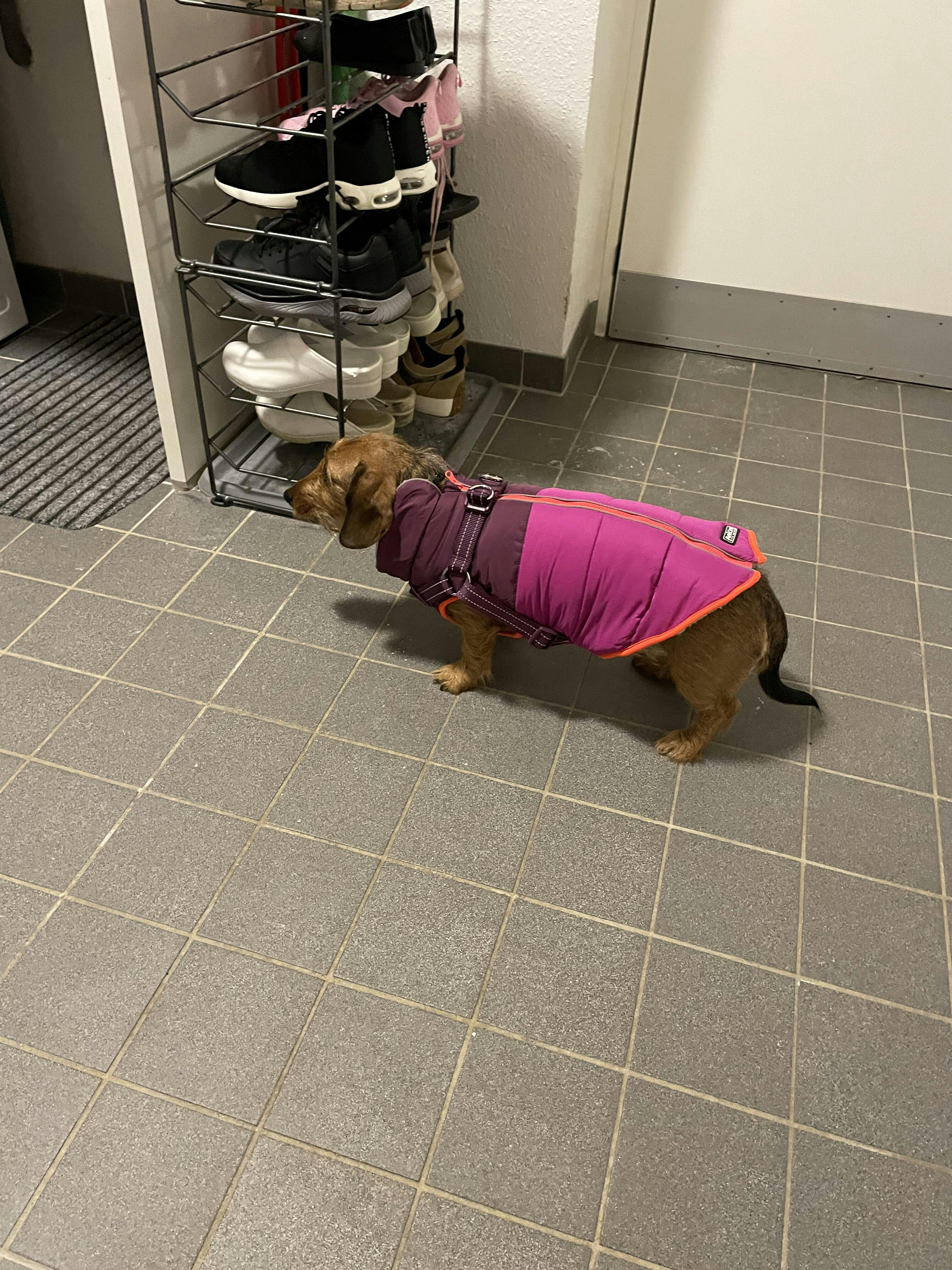 Den er vandafvisende og har reflekterende elementer, der beskytter din hund i mørke.