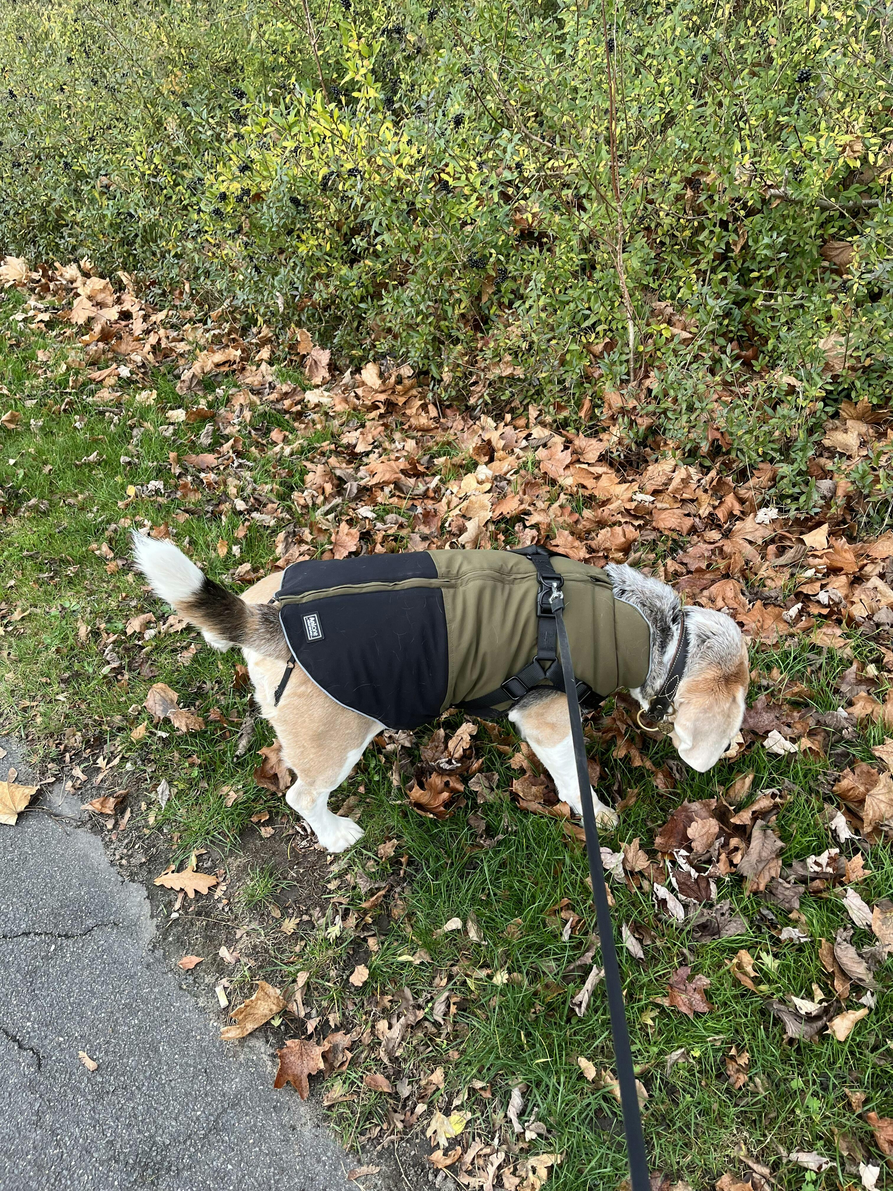 Den er vandafvisende og har reflekterende elementer, der beskytter din hund i mørke.