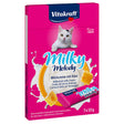 Vitakraft Milky Melody kattegodbid er en lækker snack til din kat, som er lavet af mælk og ost. Katten vil elske snackens bløde konsistens og ostesmag og tigge om mere. Du kan bruge Vitakraft Milky Melody kattegodbid som en snack mellem din kats hovedmåltider eller belønning. Vitakraft Milky Melody kattegodbid er pakket i praktiske portionsposer og skal ikke opbevares i køleskab. Vitakraft Milky Melody kattegodbid er laktosereduceret, så de fleste katte vil kunne nyde denne velsmagende snack. Vitakraft Milky Melody kattegodbid indeholder hverken sukker, kunstige smags- eller farvestoffer. Derudover er der tilsat taurin for et sundt katteliv.